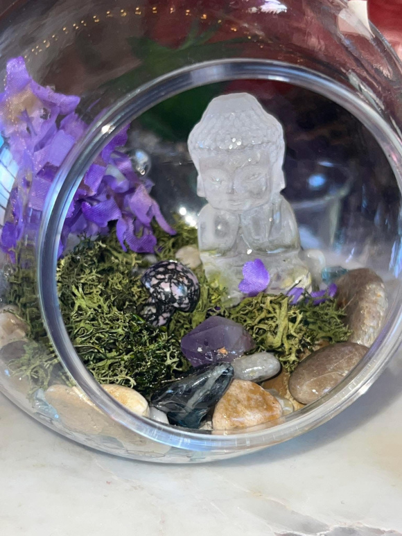 This exquisite glass decoration features a captivating quartz Buddha statue, symbolizing prayer and meditation. It also includes a variety of crystals, herbs, dried flowers, and silk flowers.