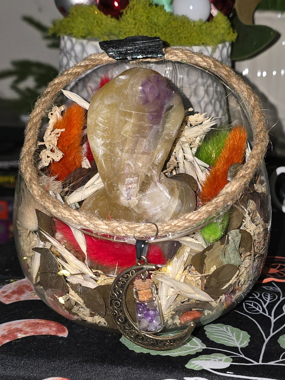 This beautiful glass decoration features an incredible large yellow fluorite snake, along with additional crystals, natural herbs, dried flowers, and silk flowers.